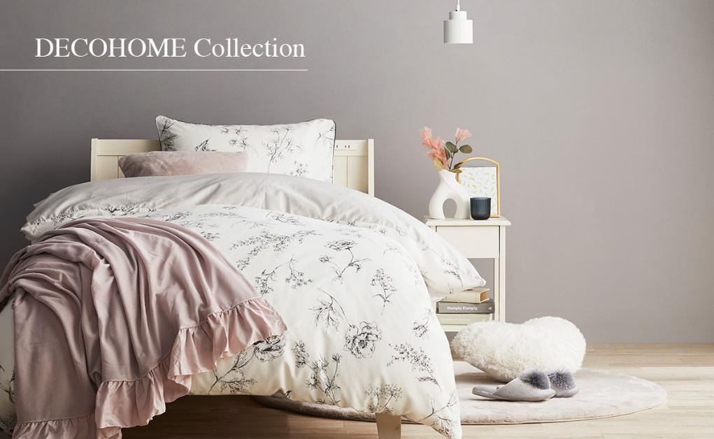 上品で甘すぎない花柄のラインアートは、デコホームの人気アイテム。モノトーン調の花柄に、ピンクカラーのブランケットとクッションを組み合わせるのがポイントです。大人女子憧れのベッドルームが叶いますよ。