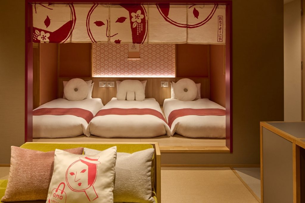 客室の中心、ベッドルームにかかる手染めの暖簾は、よーじやのロゴを主役にしたデザインに♡OMOとよーじやのこだわりが詰まった客室で、たくさん写真を撮りたくなること間違いなし!