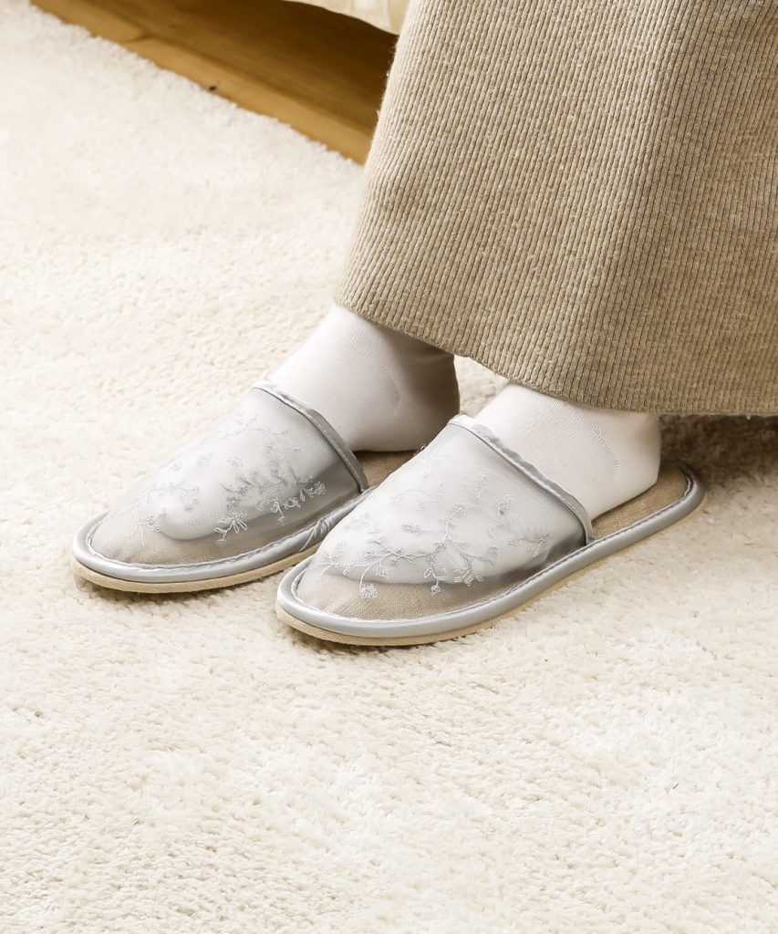 今年流行のシアー感あるルームシューズで足元の衣替えをするのはいかがですか?繊細なお花の刺繍が入っており上品な印象に見えます。お家だけでなく参観会などの学校行事に履くのにもおすすめです。