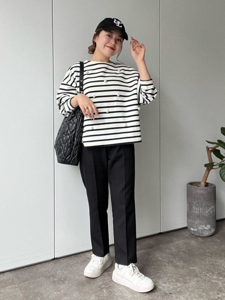 子どもの学校行事で、役員としての仕事もあるかもしれないので、ママとして“きちんと感”も意識したいところ。ボーダー柄がカジュアルなコーデでは、モノトーン・テーパードパンツ・パールデザインできちんと感をON。