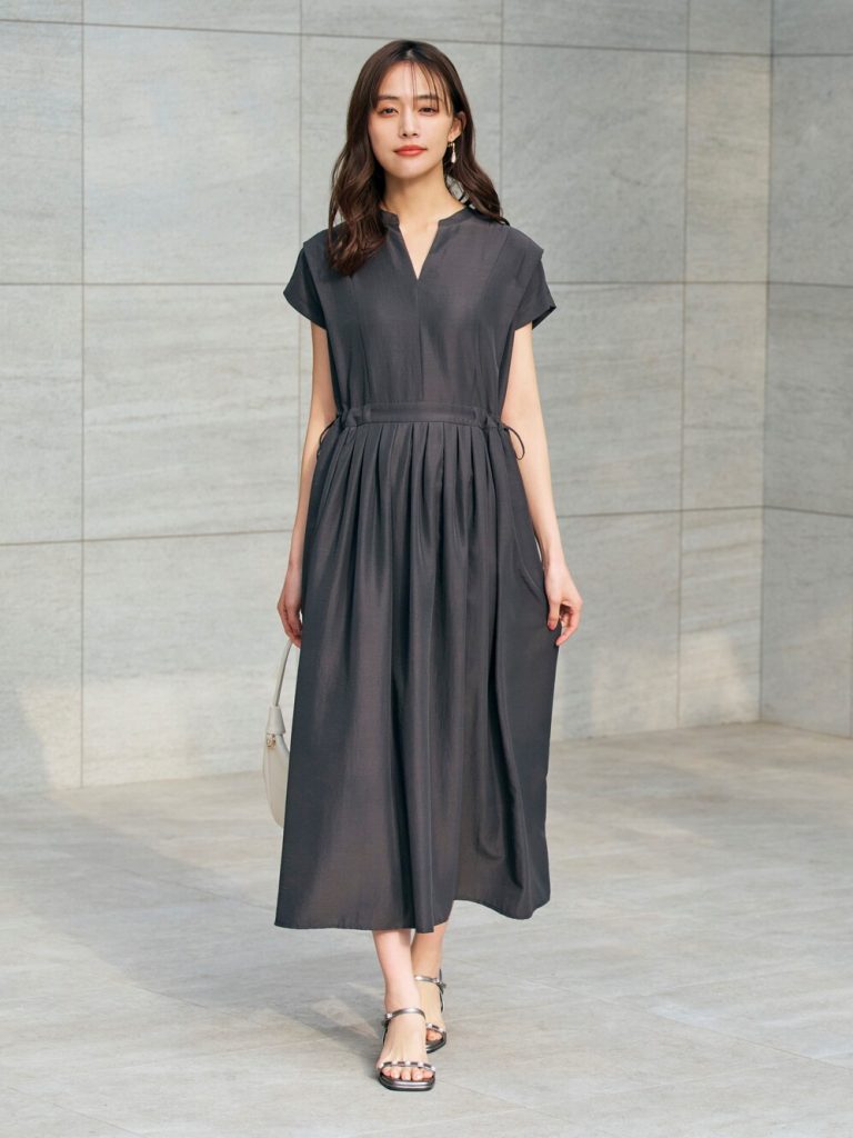 やや高めのウエスト位置でシェイプさせ、ベルトの下部分にたっぷりとタックを入れて、美しいフィット&フレアのシルエットを描くワンピース。揺れ感がエレガントな印象を作ります。
