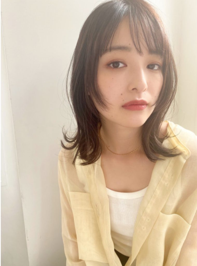 軽めのレイヤーが入っているスタイルです。顔まわりは少しだけ切り返したウルフのようなカット。ウルフもまだまだ注目なので、いいとこ取りなデザインです。透け感ある前髪で全体の重さも回避できます。