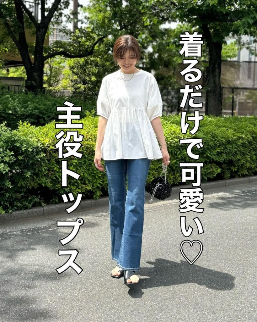 フリル感のあるボリュームたっぷりのフレアスリーブで、二の腕や上半身を華やかに体型カバーできるトップス。コットン100%のナチュラルな素材は初夏にぴったりです。モノトーンでまとめると、甘さ控えめで大人コーデにマッチ。