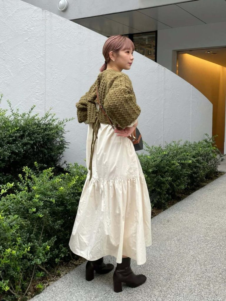 縦のラインを意識したスッキリワンピはコンパクトなカーディガンでシンプルに。カーディガンを明るい色にすることで、目線を上に上げてすらっとした印象に。