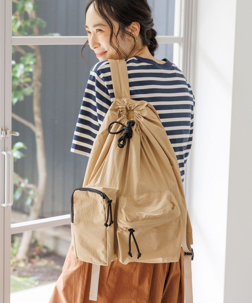 装いがぐっと今っぽくなるドロストデザインにも心惹かれます。荷物が増えそうな日や突然の雨に備えて、いつものバッグに入れておきたいリュック。
