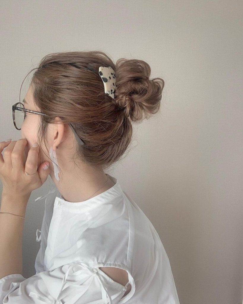 1.髪をまとめ折り返しのお団子にする。