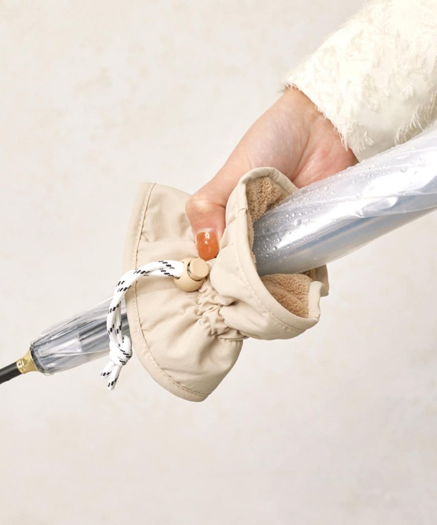 内側に吸水性・速乾性のあるマイクロファイバー生地を使っているから、さっと傘の水滴を拭き取ることが可能。拭き取ったあとは先端につけておけば落ちる水をキャッチしてくれます。目印にもなりますよ。