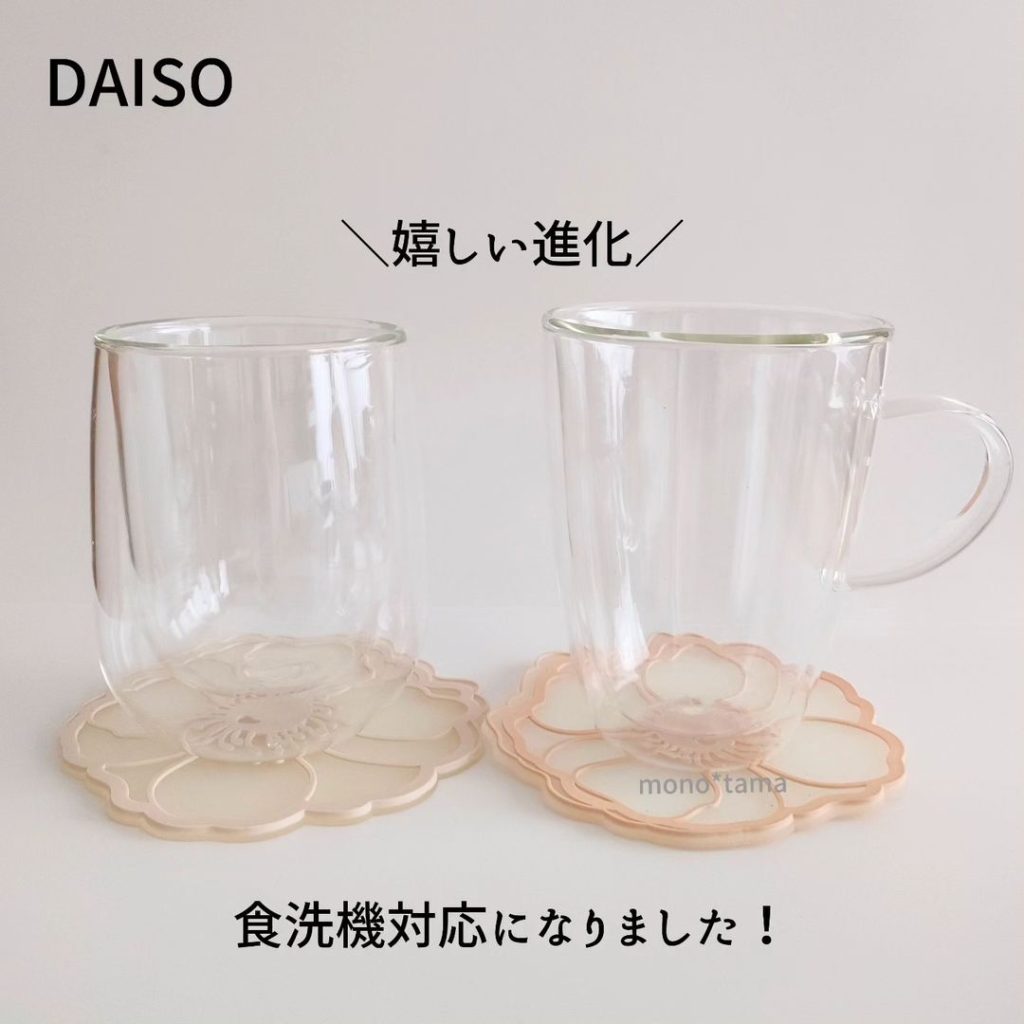ダイソーで大人気のダブルウォールグラスが、なんと食洗機対応になりました。ダブルウォールグラスは水滴もつかないので、夏のドリンクグラスにもおすすめです。持ち手付きとなしのタイプ2種類あります。