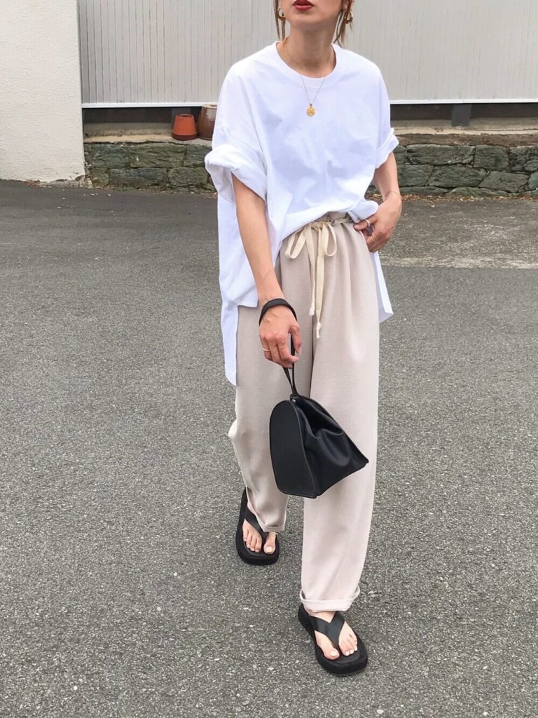リネン混素材のシアートップスに、白パンツを合わせたクリーンな印象のカジュアルコーデ。バッグとサンダルは黒で統一して全体を引き締めて。