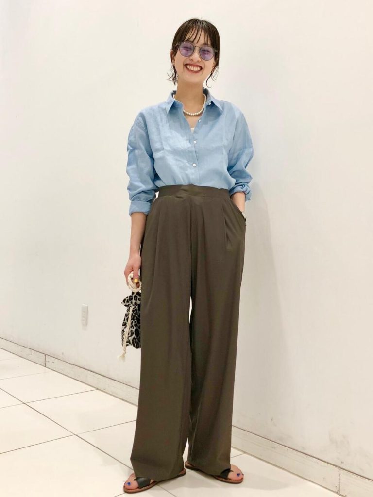 シャツとイージーパンツのラフスタイル。リネンの風合いが清涼感を演出して爽やかな印象に。パールやアニマル柄の小物を合わせて上品さもプラスして。