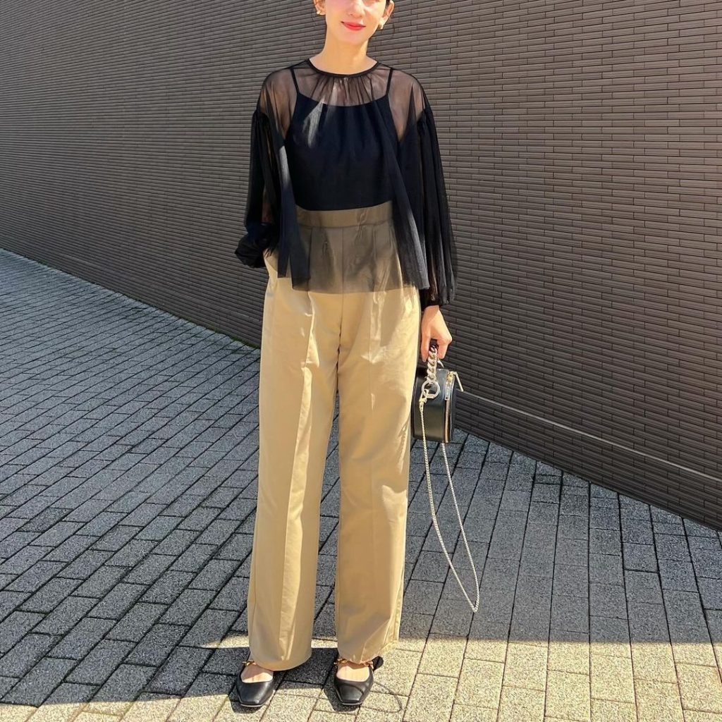 ふんわりボリュームのある袖のトップスは、「黒」を選んですっきり&大人っぽさを。ほどよいフェミニンさで、ベージュ系のタックパンツがきれいめに仕上がります。暑くなる季節に、ボトムスを選びません。