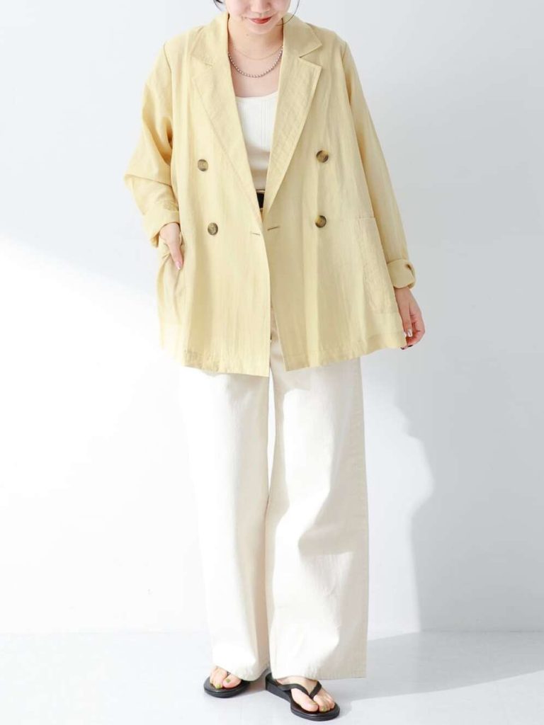 初夏の肌寒い日にも活躍するテーラードジャケットをパステルイエローで選ぶと、コーデ全体が華やかになります。