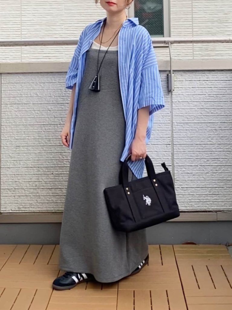 キャミワンピやノースリーブトップスにカーデではなくシャツを羽織るのは、イマドキの定番スタイル。そこにストライプ柄をチョイスすれば、甘すぎない爽やかさを感じられます。