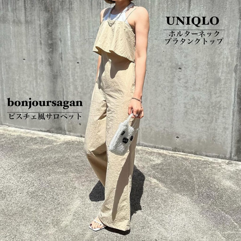 ひらりと華やかなビスチェとの重ね着に見えるサロペット。ワイドシルエットのパンツは楽ちんできれいめです。シワ感のある素材なので、洗濯後のシワも気になりません。ベージュのサロペには、ブラトップINで涼しげコーデに。