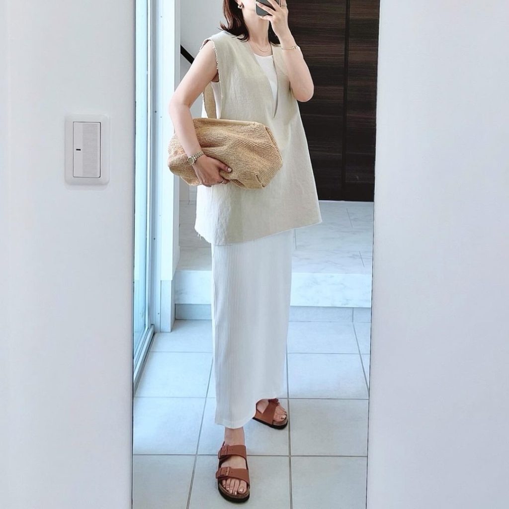 ベストはトレンドなVネックにリネンを混ぜているから、涼しく着られます。2つとも1枚で着映えするアイテムなので、この時期から手に取りたくなること間違いなし。