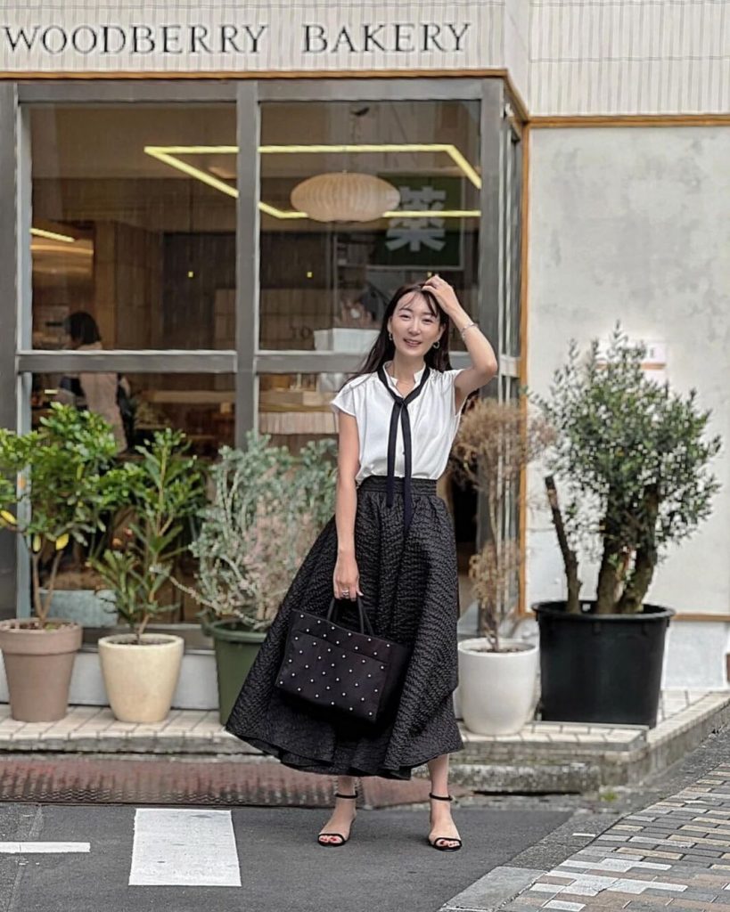 透け感のあるシフォン素材のスカートは、ボリュームのあるティアードも軽やかに見せます。ホワイトのスカートには、バルーン袖の黒トップスを合わせて、色とシルエットでメリハリを意識。フェミニンコーデはモノトーンで大人っぽく。
