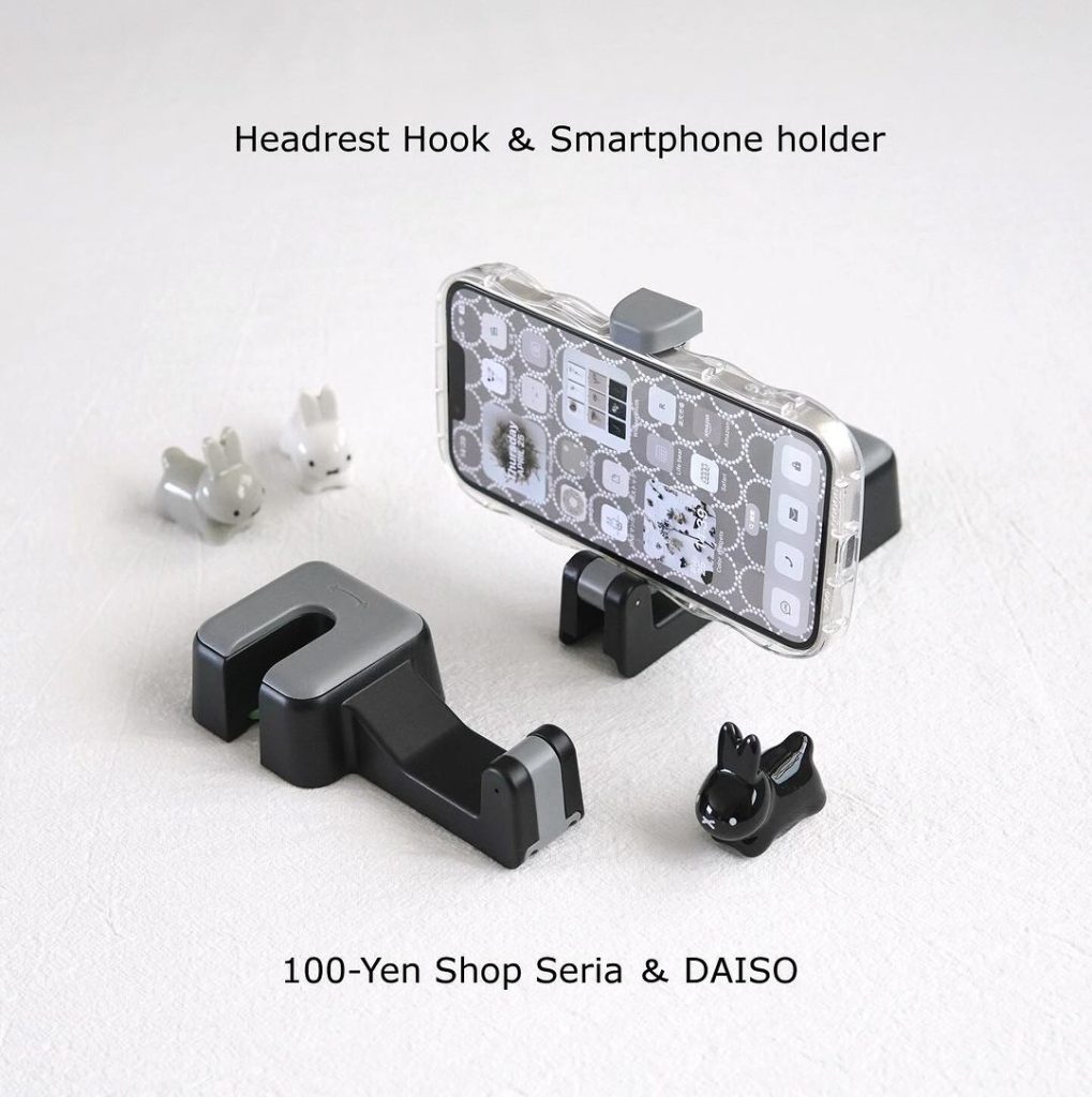 車の座席のヘッドレストに取り付ければ、フックにもスマホホルダーにもなるアイデアグッズです。長時間のドライブや帰省、旅行などの時、車にセットしておけばお子さんも動画など見れて助かりますね。