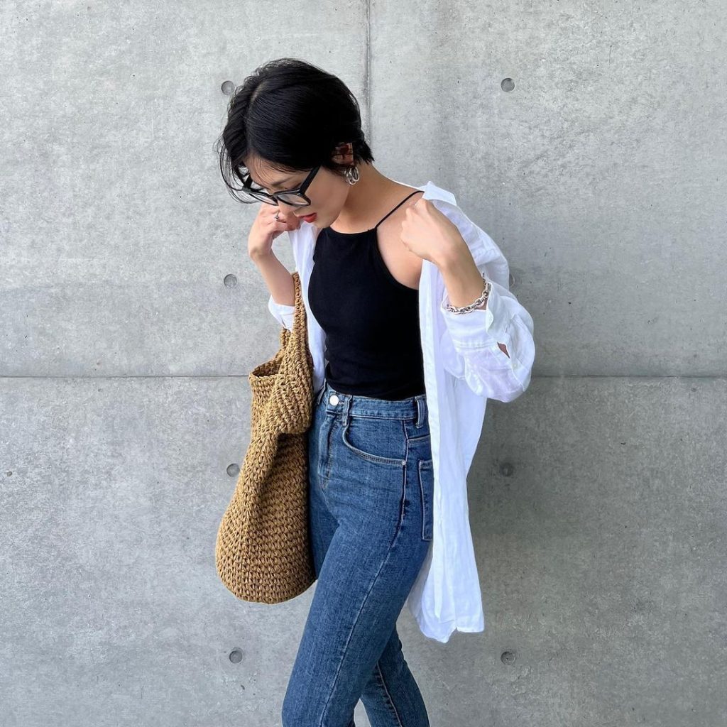 ⑥と同じベージュカラーのシアーシャツをデニムと合わせた大人カジュアルコーデ。インナーは白で、サンダル、カゴバッグと合わせることで爽やかなサマーコーデになります。着回し力抜群のおすすめアイテム。