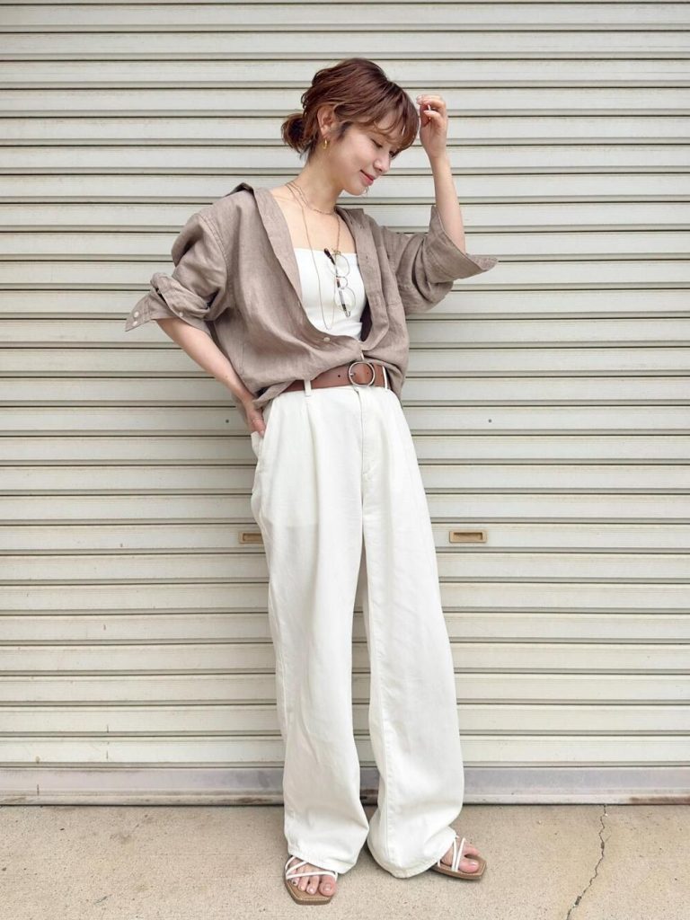 淡い色が多くなる夏コーデでは、白やベージュ系のシューズがしっくりときます。ヌーディなストラップサンダルはどんなコーデにも合わせやすく、1足持っていると重宝しますよ。