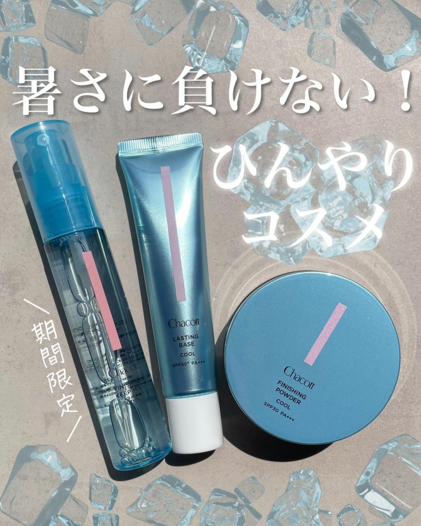 今年も数量限定で登場したチャコットの冷感コスメシリーズ。キープミスト・下地・フィニッシングパウダー、どのアイテムもひんやり気持ち良くトーンアップやキープ力に優れています。水色の爽やかな見た目も涼しくて◎。