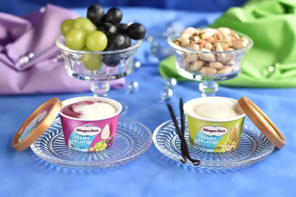 商品名: ハーゲンダッツ ミニカップ CREAMY GELATO「贅沢ぶどう」、「ピスタチオ&サマーバニラ」(期間限定)