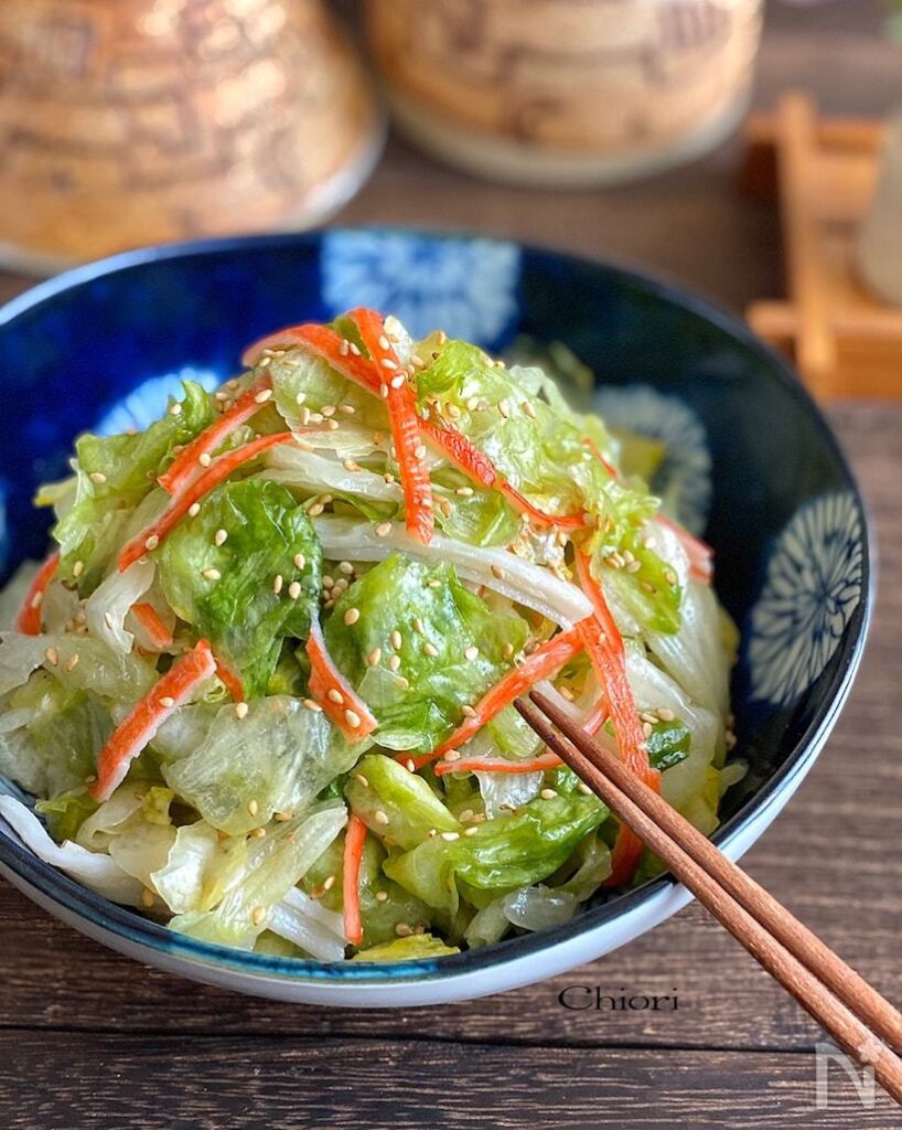サニーレタスに人参と塩昆布を組み合わせた和風サラダ。レタスにごま油をまとわせてから他の材料を和えるので水っぽくなりません。人参のオレンジがレタスの葉に映えて彩りもきれいです。