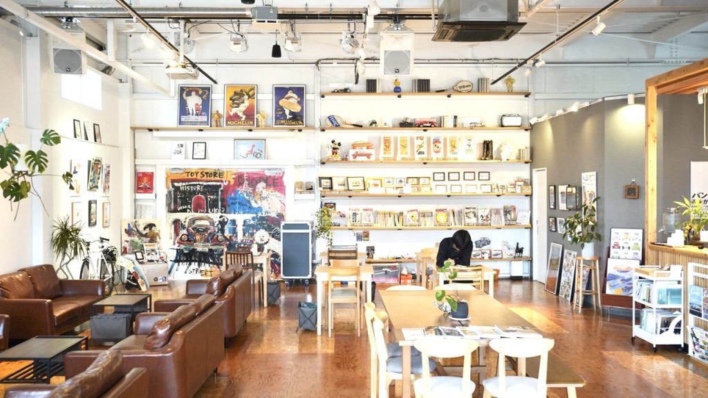 店内は開放的なガラス窓とゆったりくつろげるソファ席があり、アートな空間でくつろげます。代表の磯輪高志さんは、コロナ禍をきっかけに「地域の人々が交流できる場所を提供したい」との思いから同店をオープン。磯輪さん行きつけのミニカーショップが閉店したことを聞き付け、その跡地に店を構えたといいます。