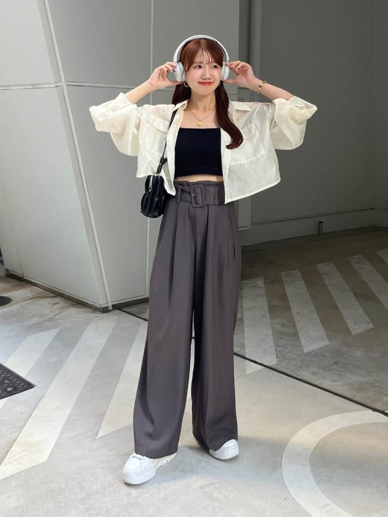 ハイウエストなワイドパンツにクロップド丈のキャミソールを合わせたストリートライクな韓国カジュアルコーデ♡