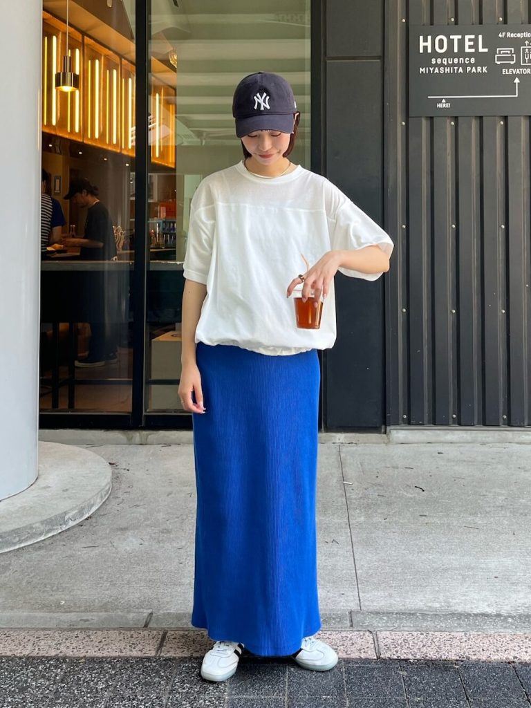 エレガントなIラインスカートもメンズライクなキャップをが外し役となって、親しみやすい印象に。ドロストデザインのTシャツをあわせて、今っぽい着こなしにアップデート!