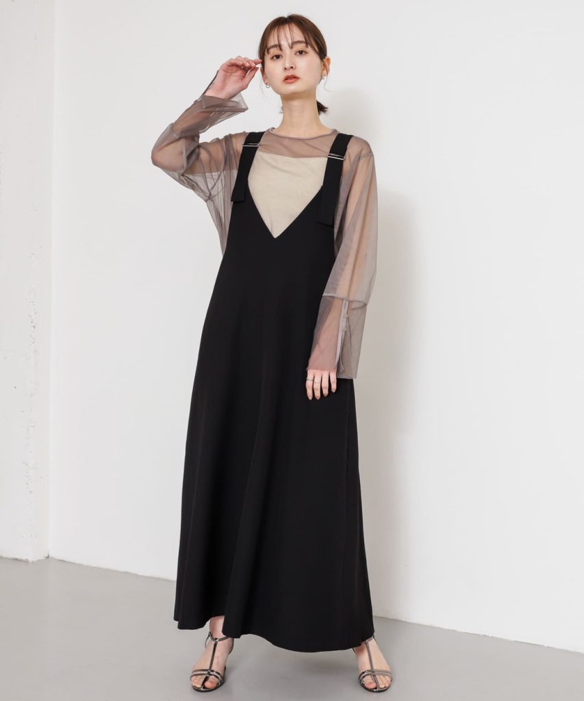 タイトなシルエットのジャンパースカートで女っぽく
