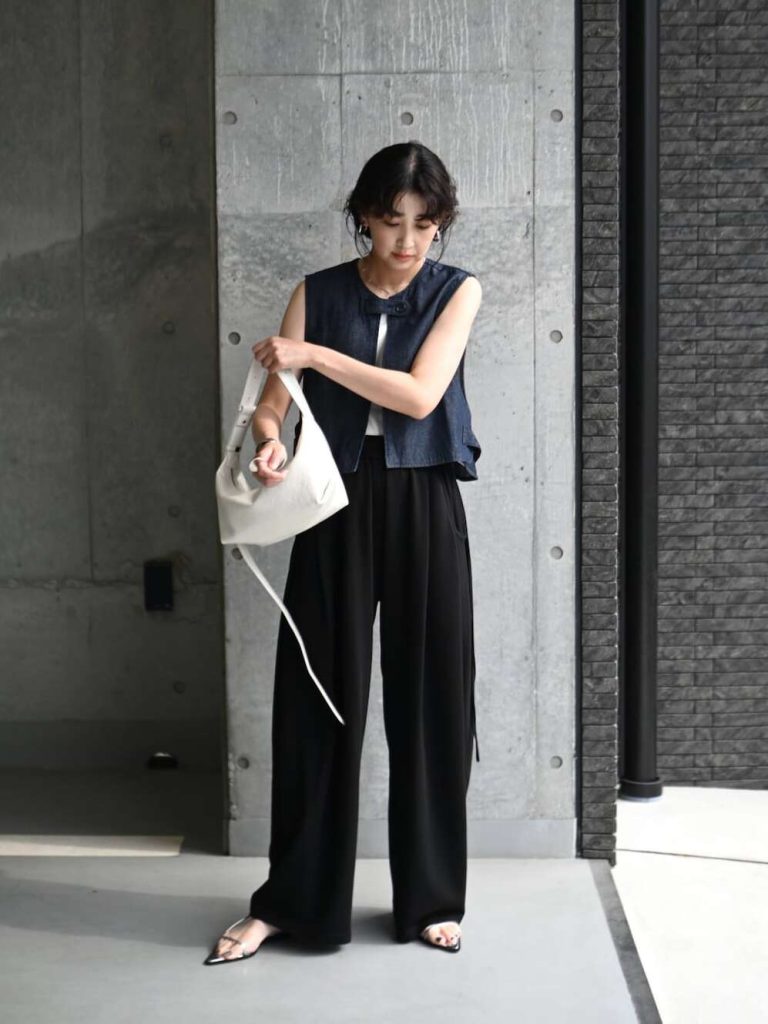 スラックスやテーパードパンツもいいけれど、ボトムスをカーブパンツに変えるだけでいつもと違うジャケットスタイルに。特にモノトーンは、きちんと感が出やすいので是非お試しを。