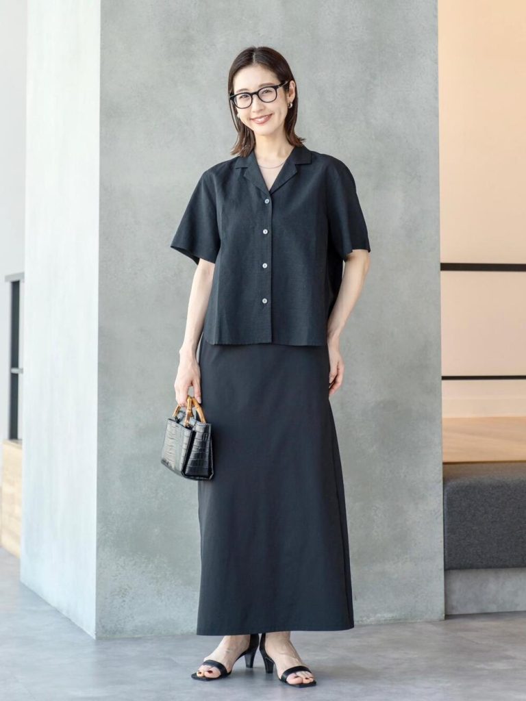 リネンの清涼感と、レーヨンのなめらかさで快適に着こなせる、オープンカラーシャツ。ゆとりがありながらもシルエットがきれいで、1枚で様になります。オールブラックコーデでも爽やかなのは、トップスの素材感やデザインのおかげです。