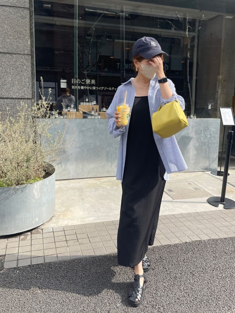 Yシャツを羽織ることで紫外線対策をしっかりしながらもコーデに爽やかさをプラスします。シンプルなキャミワンピースは身体のラインを綺麗に演出♡足元をスニーカーにしてもカジュアルダウンして可愛いですよ。