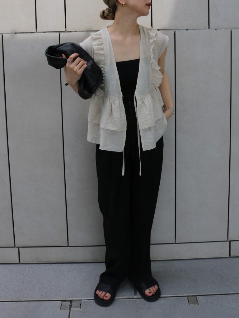 ブラックでまとめたスラックスコーデには、リネンのベストを合わせることで軽やかさが出て夏感全開に!ラフに見えがちな素材なので、フリルの甘めなデザインを選ぶと大人レディな魅力が溢れます。