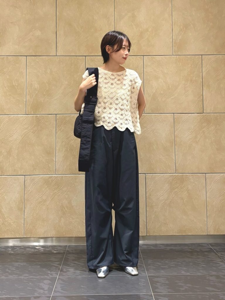 ワイドパンツはどうしても重心が下になるため、バランスを取ることが最優先。そこでチョイスしたいのが、ショート丈のレースカーデ。