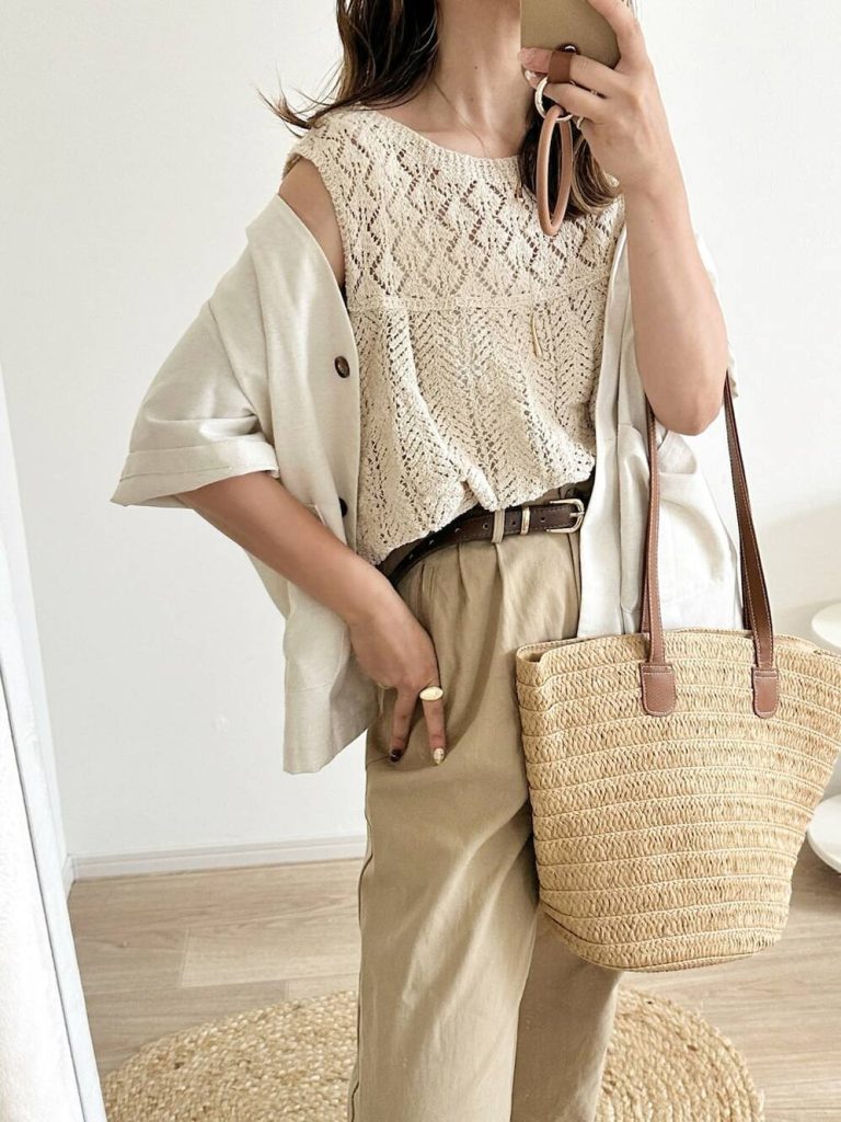 ベージュのワントーンコーデにぜひ採用したいのがチノパンツ。シンプルだからこそトップスにレースやノーカラージャケットなど映え感のあるデザインがチョイスできて、レディな着こなしが楽しめます。