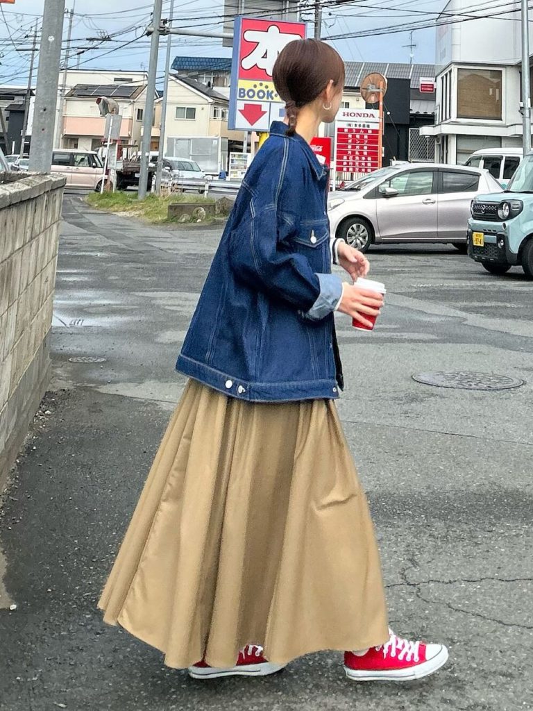 デニムジャケットと赤のスニーカーには思わずパンツをあわせたくなりますが、そこはフレアスカートでおしゃれ偏差値をグッと上げて。