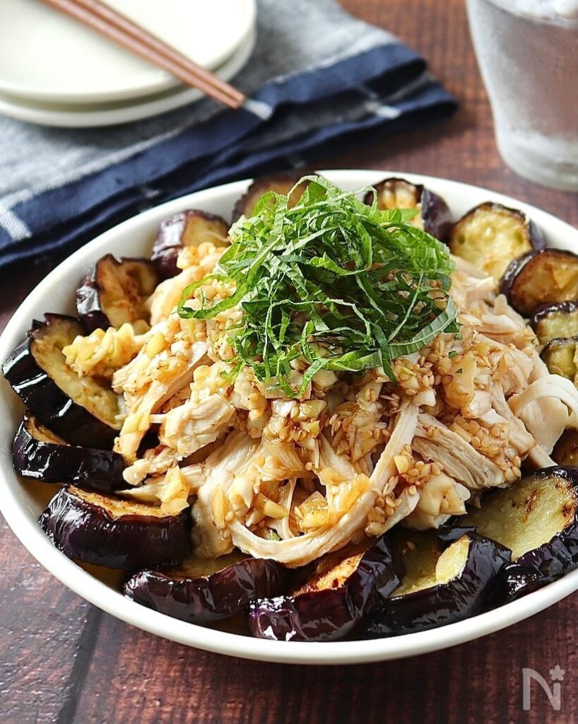 鶏むね肉と焼き茄子をあっさりとした香味ポン酢だれで楽しめる一品。つめたく冷やしてもおいしいので、猛暑日の夜ご飯におすすめのレシピです。大葉をトッピングして爽やかに仕上げましょう。