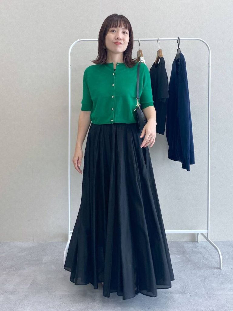 ダークグリーンやブラックでまとめれば、一気に大人顔にシフトチェンジ。きれいめなスカートを穿いて、ふんわりとした印象をアピールして。