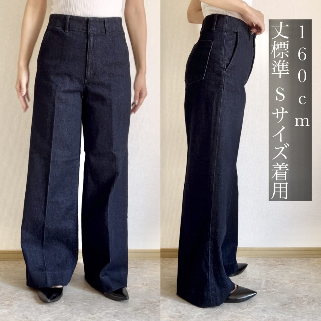 160cmで丈標準のSサイズを着用するとこのようなサイズ感に。太ももから裾にかけてゆったりと余裕のある作りで、腰回りのみすっきりとしています。