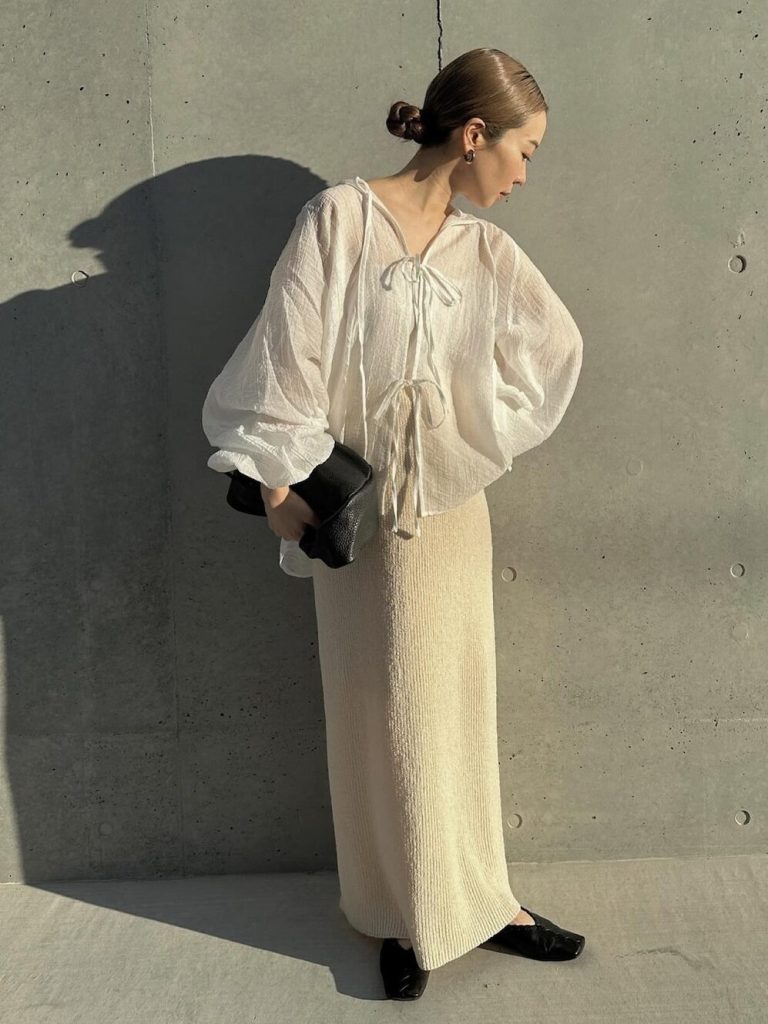 ヘルシーな肌見せは、大人のオシャレに欠かせないテクニック。一番上のリボンだけ結ばずデコルテを見せれば、抜け感たっぷりに。リブスカートのIラインで縦を意識したスタイリングにまとめましょう。