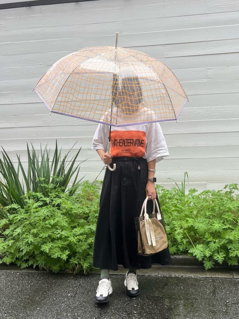 雨の日コーデは濡れた時にシミができてしまうのでダークカラーを選びがちですが、あえてポップな色味をチョイスすることでワンランク上のおしゃれを楽しむことができます。是非雨の日にこそトライしてみてくださいね。