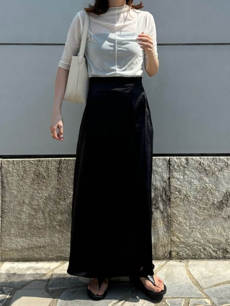 透け感がきれいな白トップスには、光沢感のあるサテンスカートがベストマッチ。涼感たっぷりな品の良さが漂う着こなしです。足元にラフさを加えて、バランス感を重視するのも洒落見えのコツです。