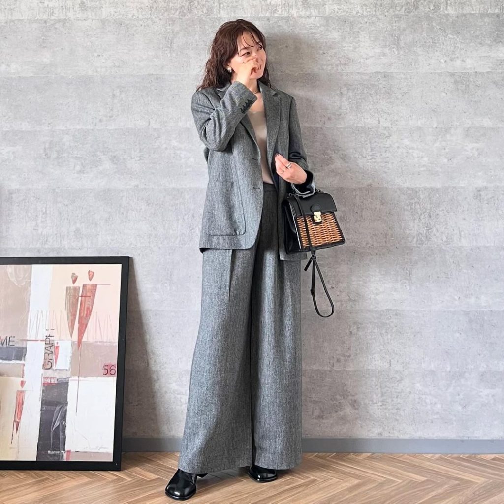 ツイードのタックワイドパンツは、かなりゆったりめのシルエットが今っぽいです。タック入りのラインがきれいで、スタイリッシュにはきこなせます。トップスはコンパクトでもオーバーサイズでも似合います。