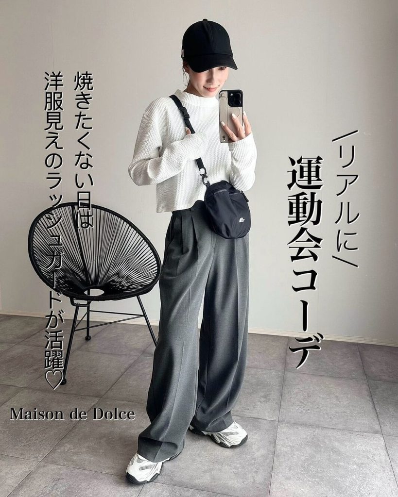 運動会が行われるグラウンドは砂埃でお洋服が汚れてしまいがち。観戦するだけでも足元は結構汚れがついてしまいますよね。気軽にお洗濯やお手入れができる生地を選んでコーディネートするのも大事なポイントですよ。