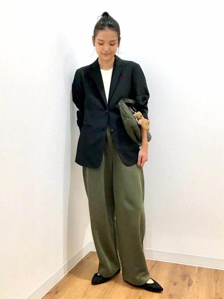 ドライな風合いでジャケットスタイルもマニッシュに導くオリーブカラー。ブラックよりも柔らかな印象があるので、程よく肩の力の抜けた着こなしが叶います。バレエシューズでレディ要素をプラスすれば、オフィスカジュアルとしても活躍する大人コーデの完成です。