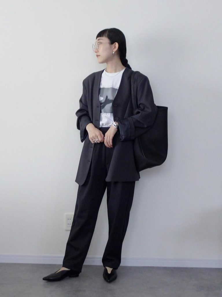ゆったり大きめで腰が隠れる丈感のノーカラージャケットと合わせれば、より魅力の引き立つコーディネートが完成しますよ。