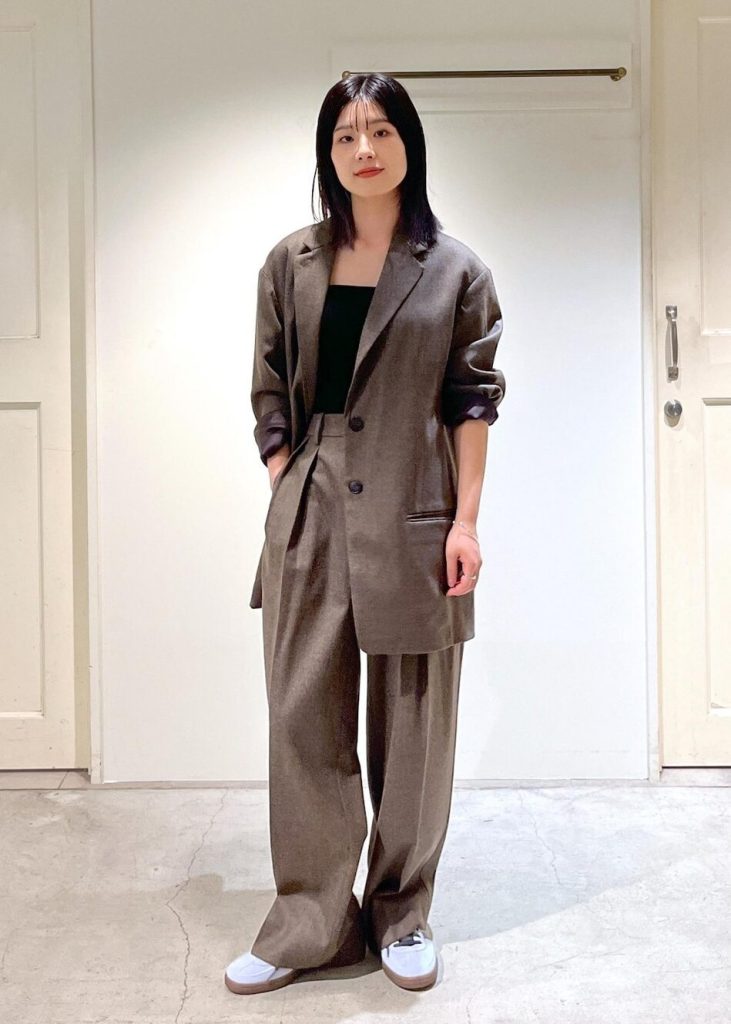 オーバーサイズのテーラードなら、スウェットやニットとも重ね着できて、きれいめもカジュアルも自由に着回せます。ミニ丈がかわいいコーデでも、ブラウンテーラードをゆるっと羽織れば、秋らしさがアップです。