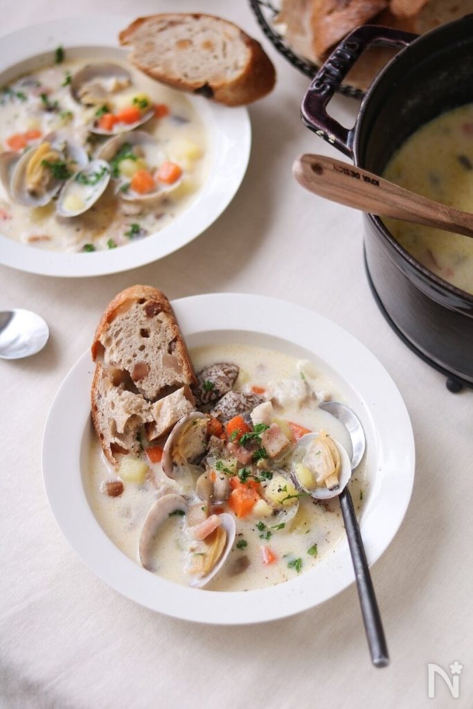 あさりのうまみが染み込んだクリームスープがおいしい、本格的なクラムチャウダー。生クリームは使っていませんが、コクのある味わいに仕上がっています。あさりは丁寧に下準備をして調理しましょう。