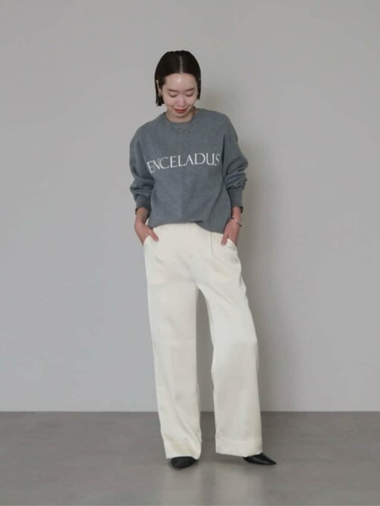 ロゴありニットだと、よりスウェットのようにカジュアル見えしますね。シンプルなデザインのおかげで、ラフになりすぎません。グレーのニットには白のワイドパンツを合わせて、リラクシーできれいめに。